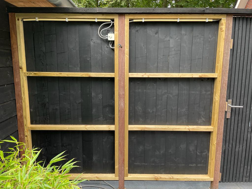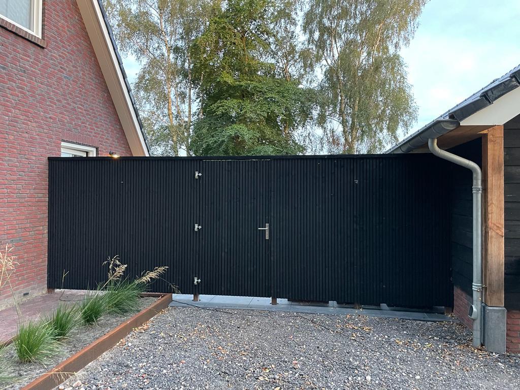 Deze schutting is samengesteld met een van onze adviseurs. Het moest een strak geheel worden. De klant heeft de uitvoering zelf gedaan. De constructie is van hardhout en betimmerd met zwart gespoten tripleprofiel. De deur is in dezelfde stijl gemaakt en mooi geïntegreerd in het geheel.
